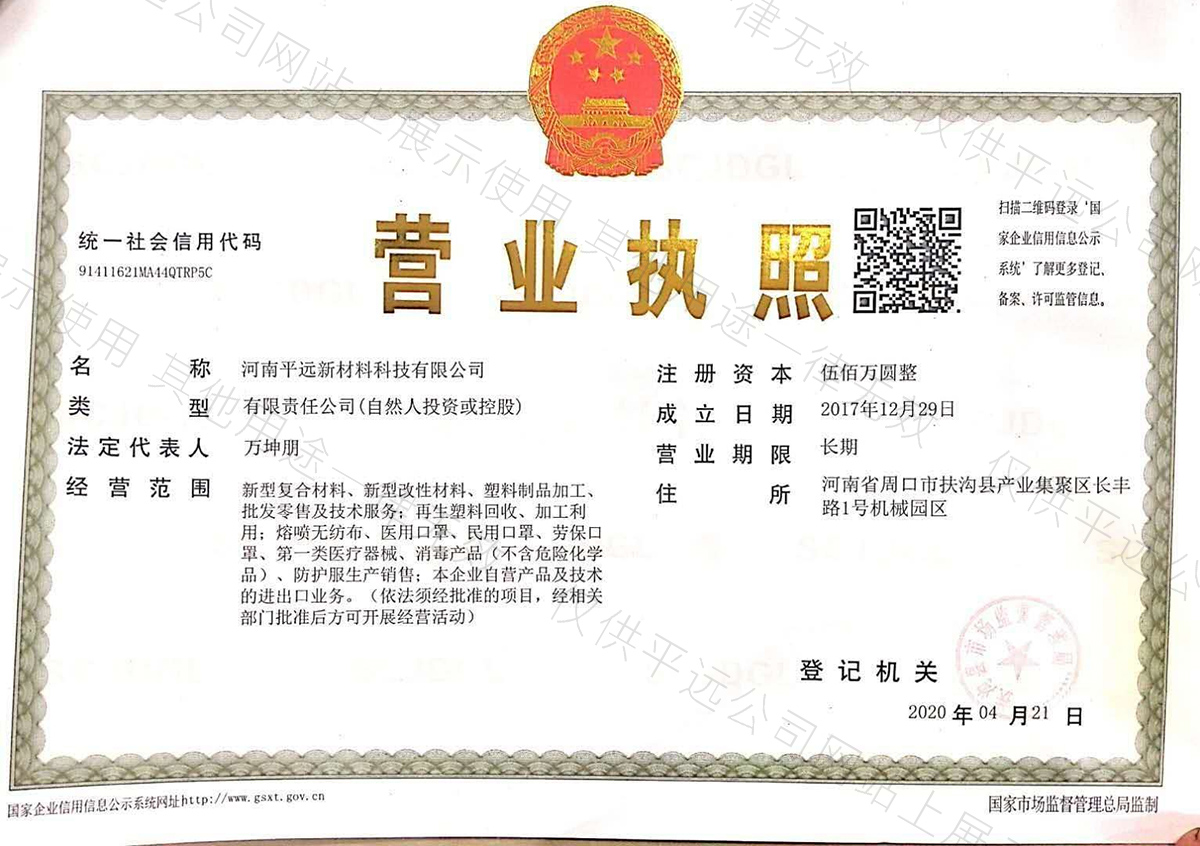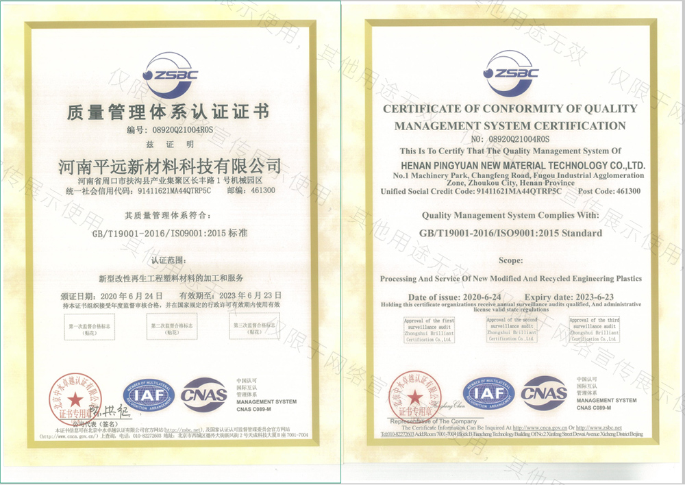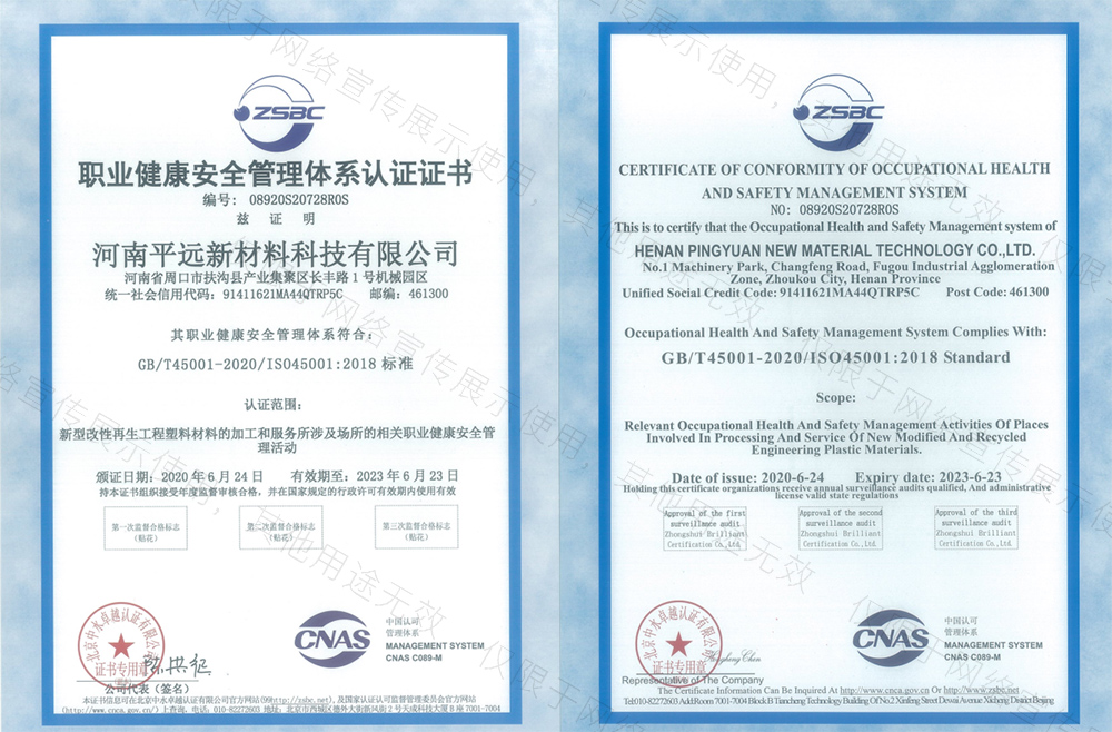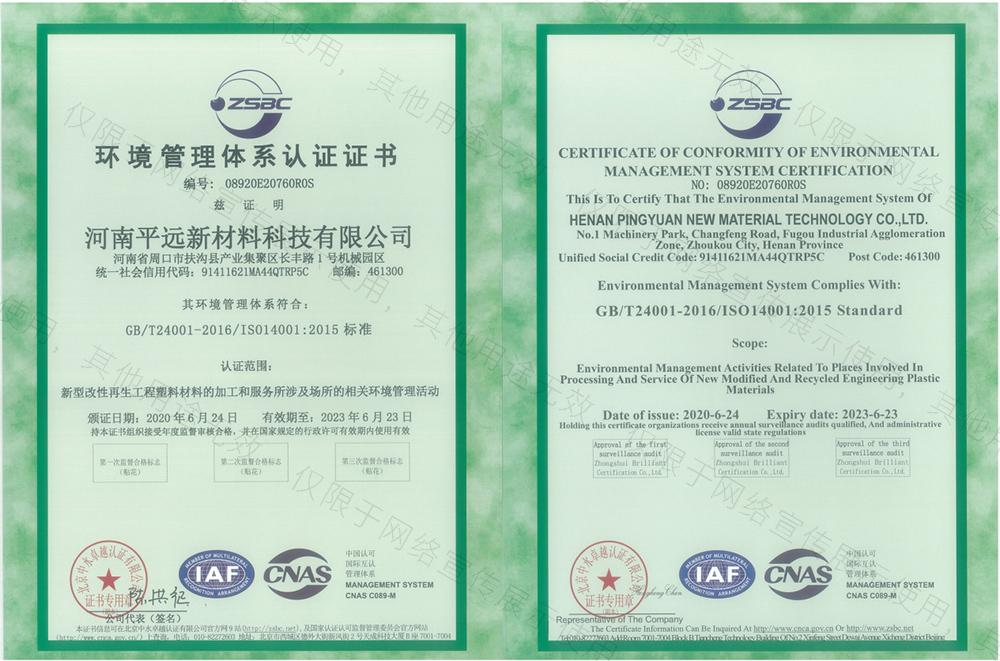河南平遠新材料科技有限公司生產(chǎn)基地坐落于河南省鄢陵縣先進制造業(yè)開發(fā)區(qū),工廠占地10000平方米。公司通過GRS全球回收標準認證、ISO9001質(zhì)量體系、14001環(huán)境體系和45001職業(yè)健康安全管理體認證。華東分公司位于浙江省余姚市中國塑料城。